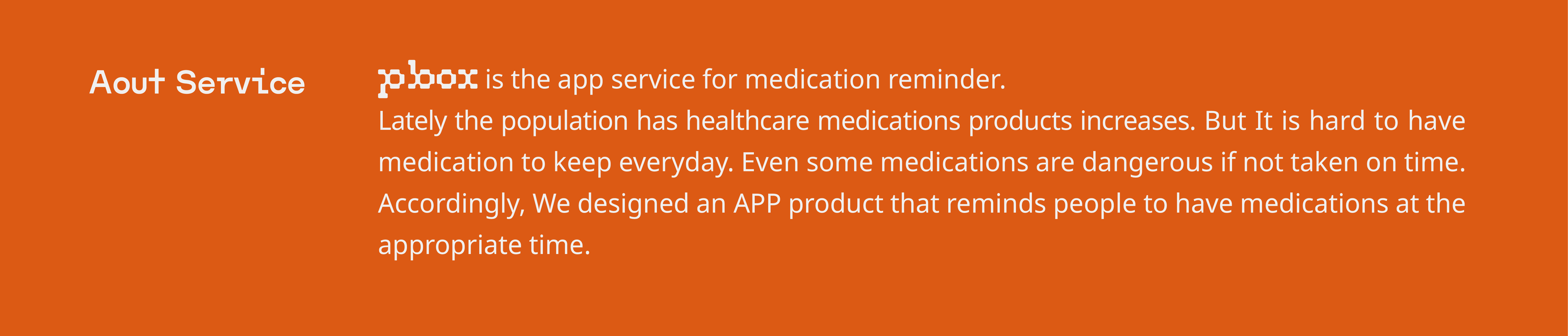 p box is the app service for medication reminder. Lately the population has healthcare medications products increases. But It is hard to have medication to keep everyday. Even some medications are dangerous if not taken on time. Accordingly, We designed an APP product that reminds people to have medications at the appropriate time.